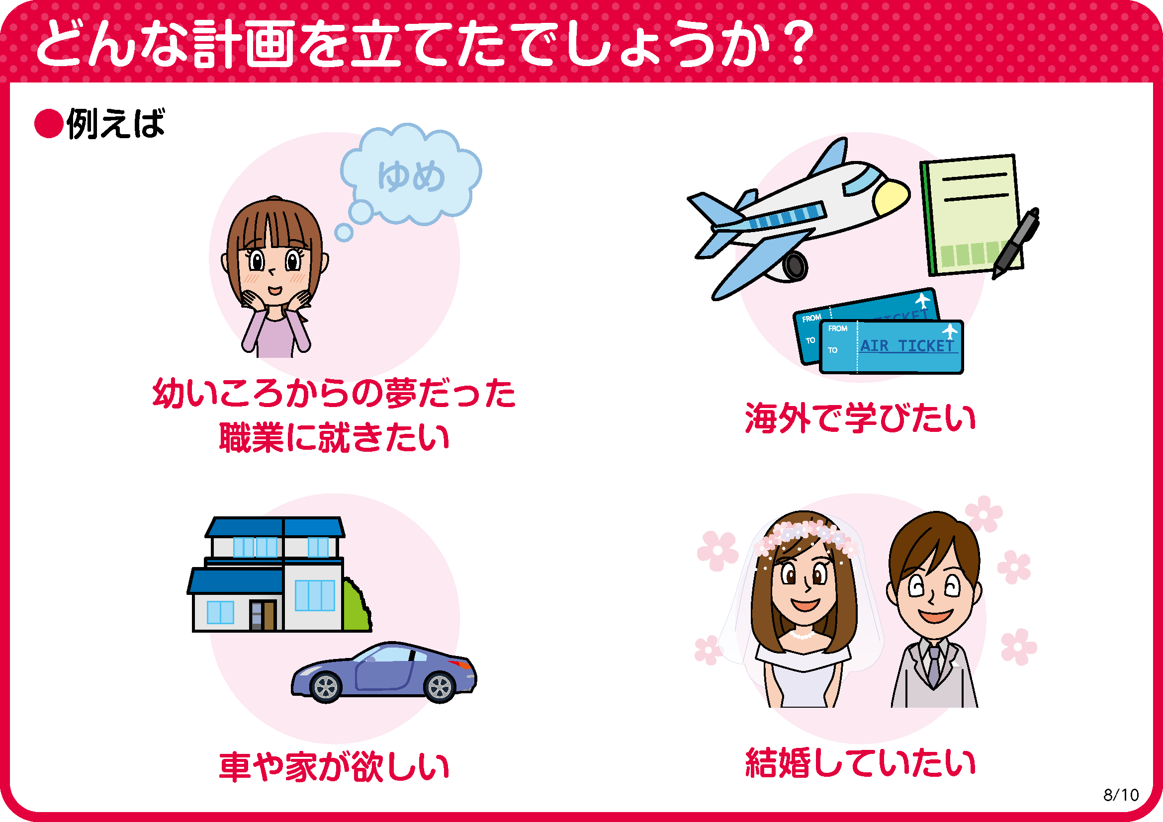 - 大きな買い物や夢のために必要なお金を、計画的に準備できる